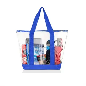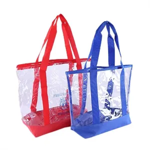 Elevate your promotional game with our clear PVC bag featuring striking 600D polyester contrast on the 25.5" straps and bottom. Complete with a handy front pocket and zipper closure, this tote is a versatile accessory. Choose from black, red, or royal blue to complement your style. Perfect for beach parties, marinas, and events, this tote makes a statement when filled with your promotional goodies. Ensure your brand stands out at 18"L x 14"H, offering a trendy and functional giveaway for your next event!